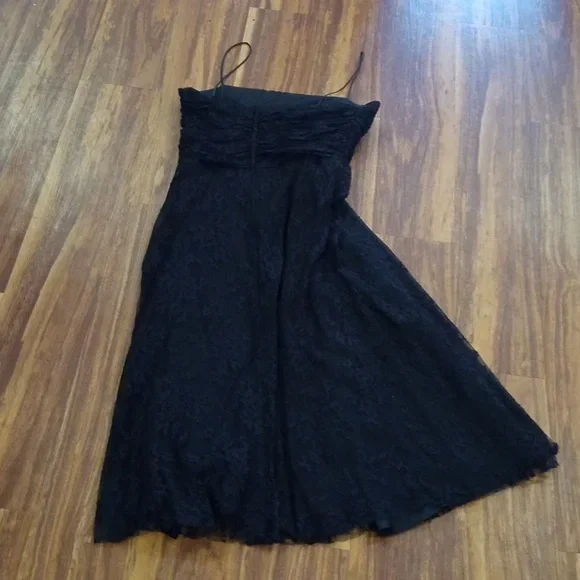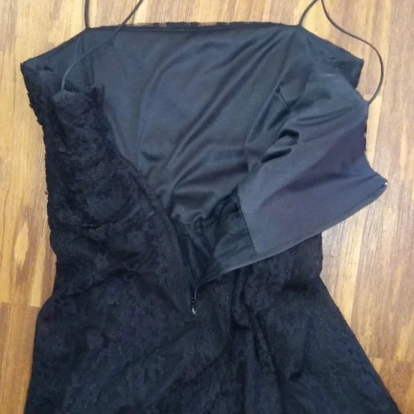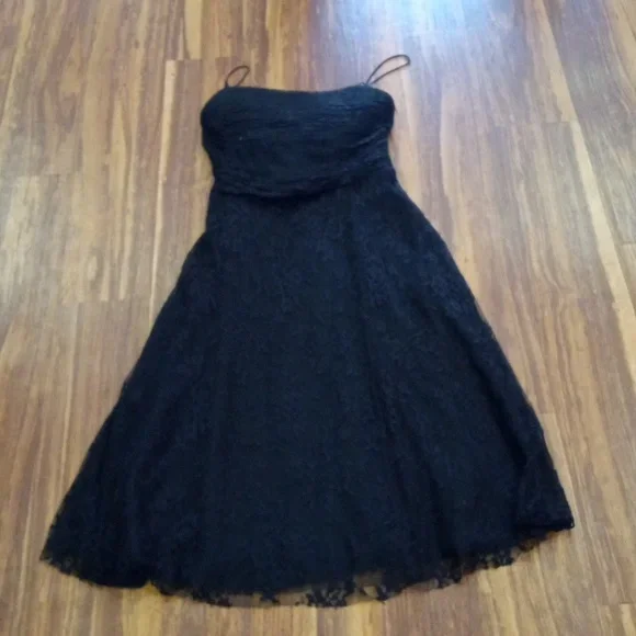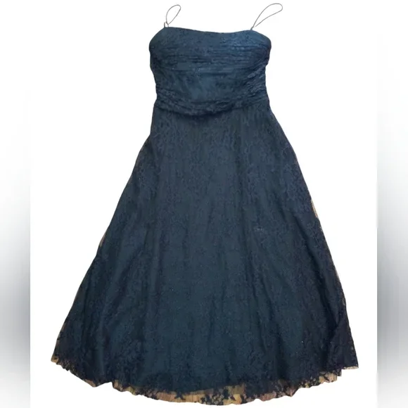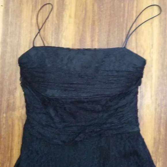 Vintage denim spaghetti strap dress . tie front detail with middle front slit. zipper closure back. stretch denim. Chesley USA. no size noted please see measurements pit to pit 21" length bust down 34"